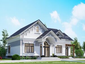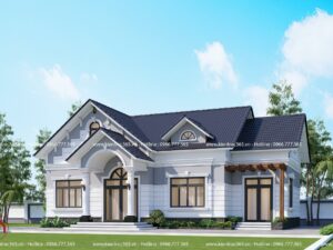 Công trình nổi bật với màu sơn tường trắng và mái ngói màu xanh ghi, tạo nên một tổng thể hài hòa và không kém phần sang trọng.