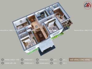 Ngôi nhà được bố trí 4 phòng ngủ và 4 phòng vệ sinh, trong đó phòng ngủ 2 và 3 với diện tích vừa phải được bố trí khu vực nhà tắm và vệ sinh khép kín trong phòng.Còn lại 2 phòng vệ sinh được làm khu vức vệ sinh chung cho các thanh viên trong gia đình. Các phòng ngủ đều được bố trí cửa sổ nhằm không khí được lưu thông và đón ánh sáng vào phòng.
